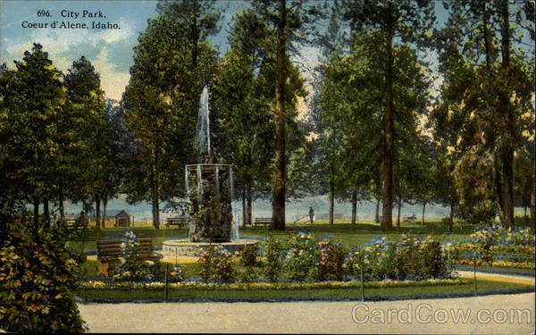 Front: 696. City Park, Coeur d'Alene, Idaho, Back: DHE 20 R-68830 F POST (IRO CARD MADE IN U. S. A, Place the Stamphere and Island Possessions Cuba Canada and MESSAGE MAY BE WRITTEN ON THIS SIDE PUBLISHED BY J. L. ROBBINS CO., SPOKANE, WASH.