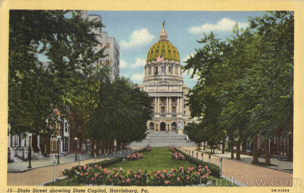Front: 15 State Street showing State Capitol, Harrisburg, Pa. OB-H2089 Back: DISTRIBUTED BY J. B. HOFFMAN, HARRISBURG, PA. GENUINE CURTEICH-CHICAGO "C.T. ART-COLORTONE" POST CARD (REG. U.S. PAT. OFF.) PLACE