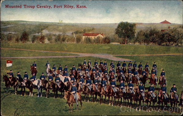 Front: Mounted Troup Cavalry, Fort Riley, Kans. Back: AND CANADA, FOREIGN, Two CENTS. R. O. Thomen, Pub., Junction City, Kas. 0384