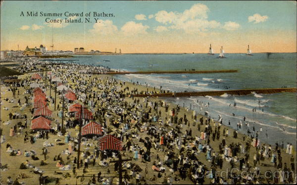 The Playground of Greater New York, comprising a population of 5,000,000 people, who seek relief from the oppressive summer heat in the cool surf. The beach extends a distance of about 3miles from Seagate to Brighton Beach and during the summer months it is visited by approximately forty million bathers C T Photochrom |