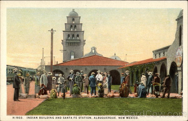 | Possibly hundreds of years before Coronado discovered them, the Pueblo Indians of the Rio Grande Valley fashioned their cooking, storage and practically all household utensils from native clay. Women from Isleta and men from San Domingo are here selling examples of this pottery, bows and arrows, etc |