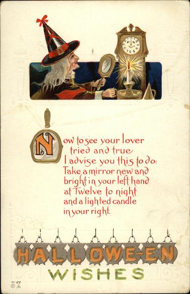Now to see your lover/tried and true/ I advise you this to do:/Take a mirror new and/bright in your left hand/at Twelve to night/and a lighted candle/in your right