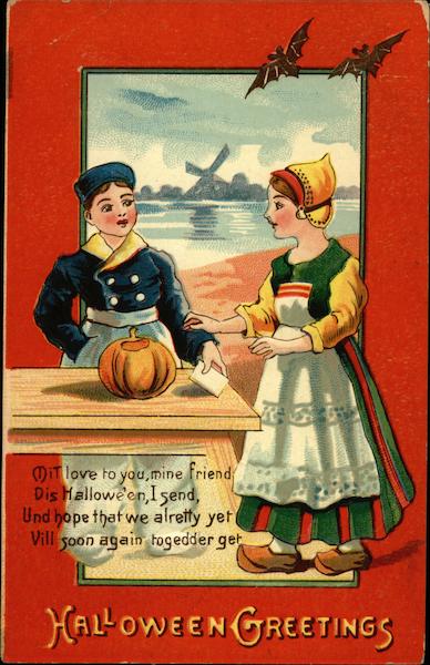 Mit love to you, mine friend/Dis Hallowe'en, I send,/Und hope that we alretty yet/Vill soon again togedder ged. A Dutch boy and a Dutch girl in costume dress stand near a table which bears a pumpkin. Bats fly about and a windmill may be seen in the background. Spelling of poem is as written on the card