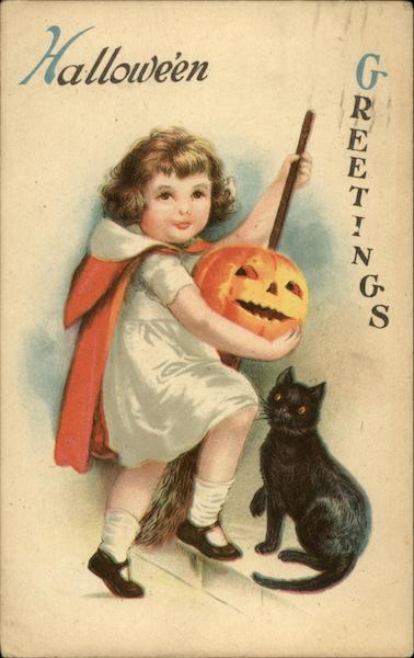 Halloween Greetings - Young Girl with Cat and Jack O'Lantern
