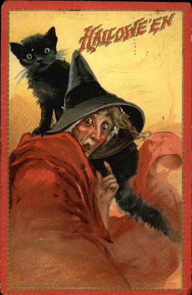 Surprised looking witch with black pointed hat and read dress. Black cat is sitting on her shoulder