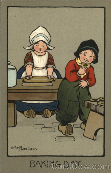 Front: F THE PARKINSON BAKING DAY 2) Back: C.W. FAULKNER & CO LTD LONDON E.C. COPYRIGHT SERIES NO 1261 B DESIGNED IN ENGLAND CW JAULKNER ITD & Co CWF Series