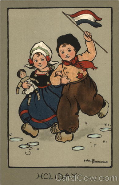 Dutch boy and girl with doll and flag