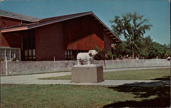 The Student Union Building at the University of Rhode Island, Kingston, R. I. Note the statue of the Ram, the U. R. I. Mascot. 45535 Published by Book & Tackle Shop, Watch Hill, R. I. 02891 Anscochrome ® Photo Copyright By B. L. Gordon Aug 8,75