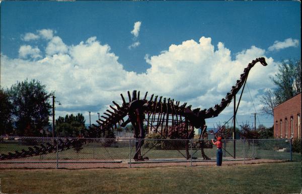 | This authentic cement replica of Diplodocus (76 feet long, 21 feet high at the head), may be seen at the Utah Field House of Natural History, Vernal, Utah. Casts were made from molds taken from the original fossil bones. This dinosaur was a plant-eater and lived in the Jurassic Age, 140 Million years ago |