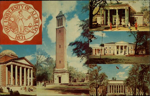 Front: OF 1831 HABANA ALA UNIVERS Back: Greetings from the University of Alabama, Tuscaloosa, Home of the Alabama Crimson Tide. Pub. by Alabama Post Card Co., Bessemer, Ala. SADI, 90998 1889 "TAGE, ... , ry