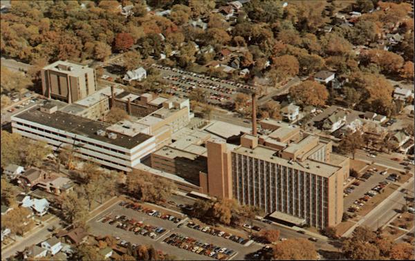in Green Bay. On right, St. Vincent's Hospital; on left, Bellin