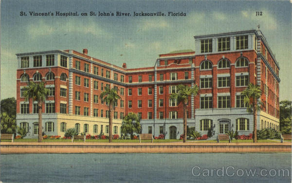 Front: St. Vincent's Hospital. on St. John's River. Jacksonville. Florida J12 Back: "TICHNOR QUALITY VIEWS" REG. U. S. PAT. OFF. MADE ONLY BY TICHNOR BROS., INC., BOSTON, MASS. 65764