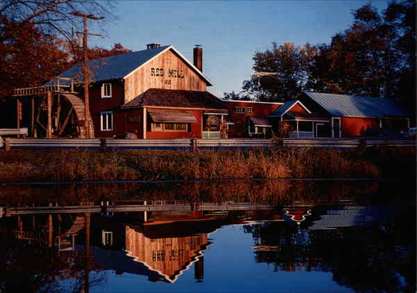 | The Red Mill Colonial Shop reflected in the mill pond on the beautiful crystal river at little hope. Originally the building was the crystal river grist mill from 1855 until 1859. It was converted into a country gift shop in 1960. Behind the mill is a covered bridge and chapel. 3 mi. so. of Waupaca on Hwy. K. Open all year |