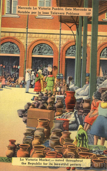 Front: Mercado La Victoria Puebla, Este Mercado is Notable por la losa Talavera Poblana 107 noted throughout the Republic for its beautiful pottery La Victoria Market- Back: MEXICAN PUB. BY SANDOVAL NEWS SERVICE. 65451