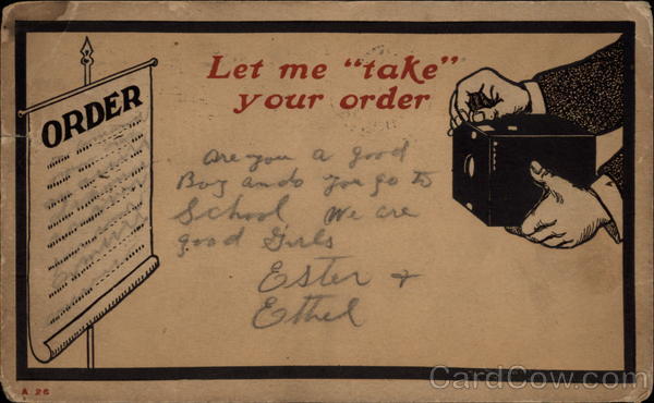 Front: Let me "take" ORDER your order are you .... a good school w cre grod Guls Ester+ Ethed Boy ando orfo 5 ..... you ge ---- A 26 Back: СО UNITED STATESOF MUNCA 30 I Pis CT ! 3-30A 19 06 IND. Canal 1290 POS HD Mr Harry Beeth 408 W8 st Musicce and