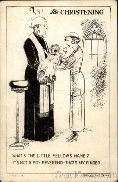 Front: 2/ The CHRISTENING WHAT'S THE LITTLE FELLOW'S NAME ? IT'S NOT A BOY REVEREND-THAT'S MY FINGER. COPYRIGHT SAMUEL GOLDRING Back: m 2 PUB. BY JOHN P. OLIVE, ATLANTIC CITY, N. J.