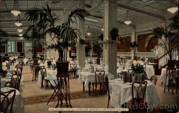 Front: NATIONAL HOTEL WINTER GARDEN,WASHINGTON, D.C. 11030. Back: 1) Со NATIONAL HOTEL POST (ARD J. D. KYNASTON, Mgr. RATES: American Plan $2.50 to $4.00 European Plan 1.00 to 2.50 THIS SPACE IS FOR MESSAGE Pub. by The Acmegraph Co., Chicago,