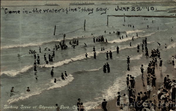 Front: "Come in-the Water's tinethey . June2210 say Juune 22D. it Bathing Sene at Edgewater Park, Cleveland, Chio. Back: ARO B. CARD. AFFIX PUBLISHED BY BRAUN POST CARD CO,, CLEVELAND, OHIO, A-6271