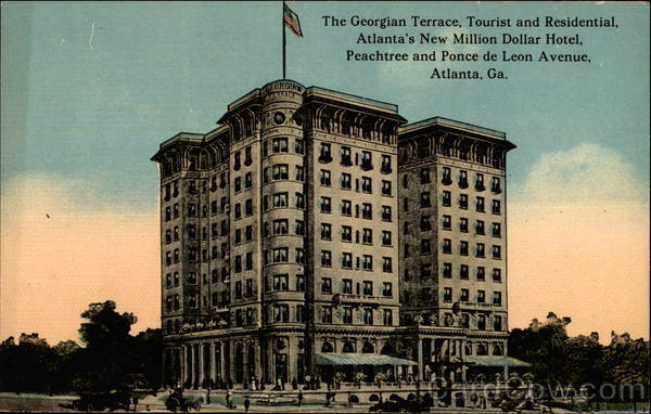 Front: The Georgian Terrace, Tourist and Residential, Atlanta's New Million Dollar Hotel, Peachtree and Ponce de Leon Avenue, Atlanta, Ga. EORGIAN Back: (۱) MADE IN U. S. A PUBLISHED BY 1. F. P: CO., ATLANTA, GA. A-19855 SUPER