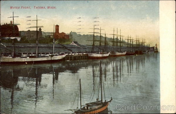 Front: WATER FRONT, TACOMA, WASH. Back: DHP 2n NEBEN UNITEI COMA, SEP 26 F 2 - PMI WASH 120 FRANK AN 1190 TAGE 1901 THE SPACE ABOVE IS RESERVED FOR POSTMARK THIS SPACE IS RESERVED FOR MESSAGE Mis Laura Veerika, 711 So. 3 st , Va Crosses wis