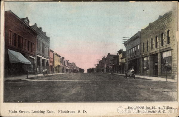 Front: EGO Main Street, Looking East. Flandreau, S. D. Published for H. A. Tiller, Flandreau, S. D. Back: DHP ba ST. PAUL SOUVENIR CO., ST. PAUL