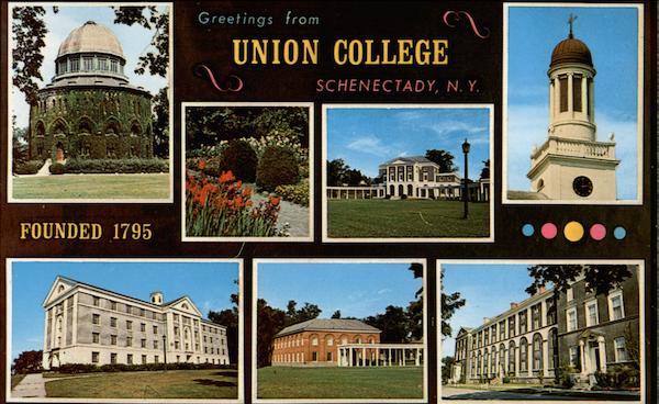 Front: Greetings from UNION COLLEGE SCHENECTADY, N. Y. FOUNDED 1795 Back: SCHENECTADY, N. Y. Views on the campus of Union College. 38068 by Joe Connors & Sons, Inc., Box 11, East Norwich, N.Y. 11732 Prestige Postcards