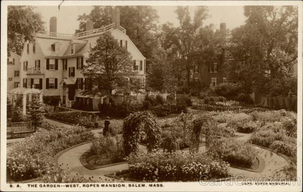Front: COPR. ROPES MEMORIAL 8. A. THE GARDEN--WEST, ROPES MANSION, SALEM, MASS. Back: 5 - AA o А << NO Z STAMP 2 Α Α 2 ο Α