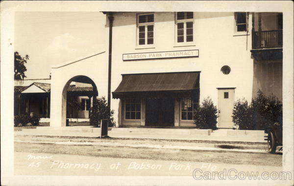 Front: BABSON PARK PHARMACY mow 45 Phormacy at Bobson Park Flo Back: Babson PARK FLI 19 POST CARD JUNE 20 2 STAMP A 2 o