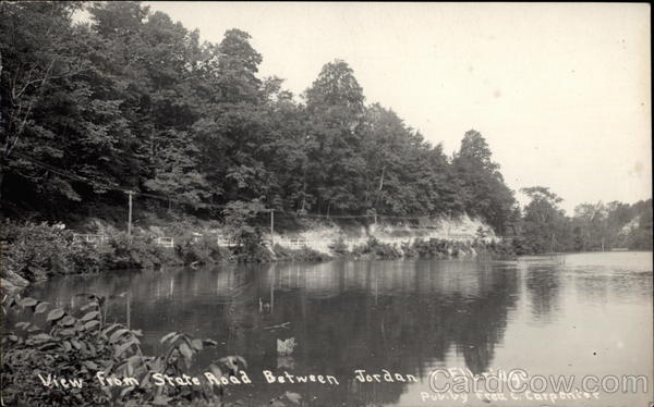 Front: View from Stete Road Between Jordan ĭ Elridge. Puliby Fred C. Carpenter Back: ces Leaf 7 се, 2 o A ÑO KERE AA 20 A HERBERT A. MYER & CO., JORDAN, N. Y.