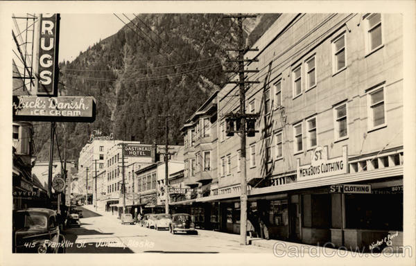 Front: licks Danish. iCE CREAM Barono GASTINEAU НОTEL ST MENEBOVS CLOTHING averne ALASKAN CAB VE MARCHE ST CLOTHINGTH BOYS HOES bTHIN 415 Franklin DI. – HUR Alaska Winter & Porid RUCS Back: S. CLOETECH