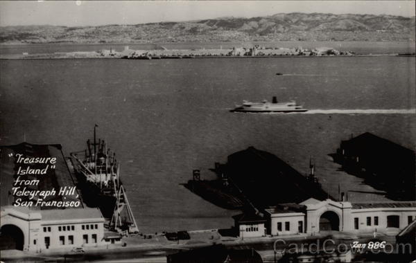 Front: Treasure Island " Teleyraph Hill %3D Zan 886 Back: 30 CORRESPOND Aun the ferry Here is "TI" again, notice and also the locke with a ship by it is the foreground, سر
