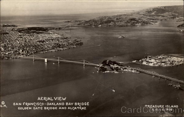 AERIAL VIEW SAN FRANCISCO-OAKLAND BAY BRIDGE GOLDEN GATrE BRIDGE AND ALCATRAZ G.M, TREASURE ISLAND G.G.I. E. 1939