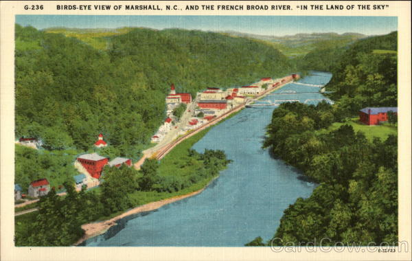 G-236 BIRDS-EYE VIEW OF MARSHALL, N.C., AND THE FRENCH BROAD RIVER. "IN THE LAND OF THE SKY" E-12723