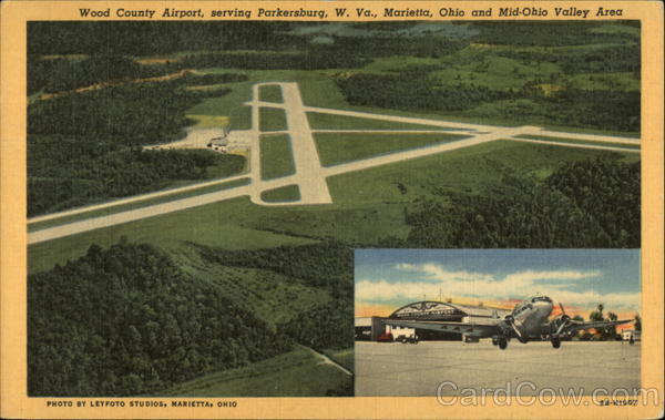 Front: Wood County Airport, serving Parkersburg, W. Va., Marietta, Ohio and Mid-Ohio Valley Area WOOD COLUNTY AIRPORT PHOTO BY LEYFOTO STU DIOS, MARIETTA, OHIO 9B-H1607 Back: DISTRIBUTED BY VALLEY NEWS SERVICE, PARKERSBURG, W. VA.