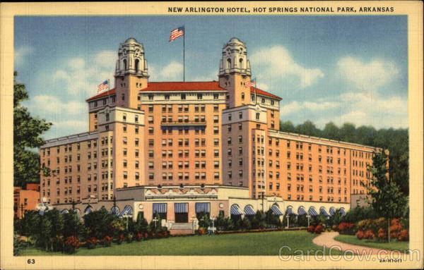 Front: NEW ARLINGTON HOTEL, HOT SPRINGS NATIONAL PARK, ARKANSAS 7 27 2 63 2A-H1011 Back: WOODCOCK MFG. CO., HOT SPRINGS NATIONAL PARK, ARK.