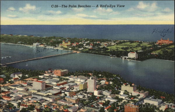 Front: C-28-The Palm Beaches-A Bird's-Eye View Back: WEST PALM BEACH, FLA. The downtown section of West Palm Beach, showing the Flagler Memorial Bridge crossing to Palm Beach. 1 B-H707 F. E. C. NEWS CO., WEST PALM BEACH, FLA.