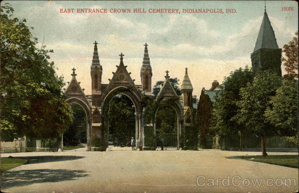 Front: EAST ENTRANCE CROWN HILL CEMETERY, INDIANAPOLIS, IND. 10076 Back: OK One Cent for United States, and Island Possessions, Cuba, Canada and For Foreign. A. C. Bosselman & Co., New York, Frieda Brinsold *** 18