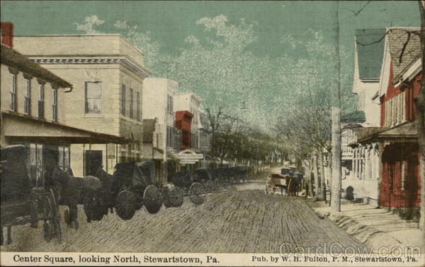 Front: Center Square, looking North, Stewartstown, Pa. Pub. by W. H. Fulton, P. M., Stewartstown, Pa. Back: Let Me Furnish Your Home Yours to Please Thos. F. Mumma, Stewartstown, Pa. Furniture Dealer. - Funeral Director. swoje do