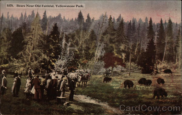 Bears Near Old Faithful The animals of the Park are objects of peculiar interest. No sounds of growl or bark of dog is ever heard, and the animals, though wild, roam at will through the Park. Almost any evening or morning one may see from one to twenty bears eating in the vicinity of the hotel |