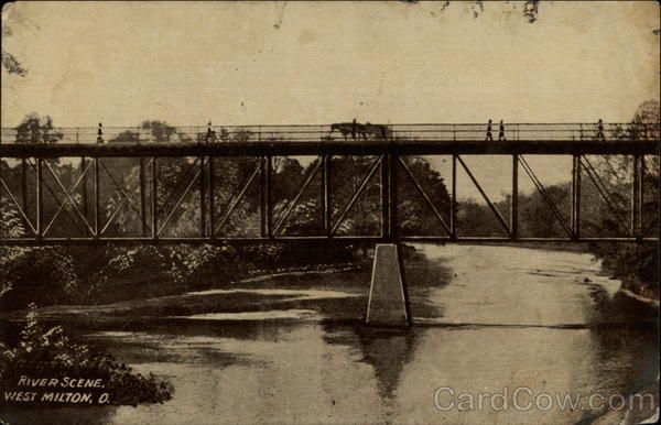 Front: RIVER SCENE, WEST MILTON, O. Back: Miss beneviene stiel B.HS. 1913 E. Huntzinget, Publisher, Piqua, O. Gliwiem matindale