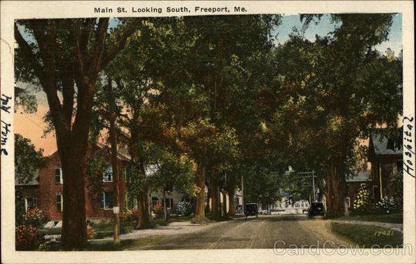 Front: Main St. Looking South, Freeport, Me. 17431 me Back: DHP 39 POST CARD For United States land Island Possessions Cuba, Canada and Hoshine Porceportmes Dr. Howard home and >COMO >*- PUB. BY KIMBALL'S PHARMACY, “THE OASIS”, FREEPORT, ME.