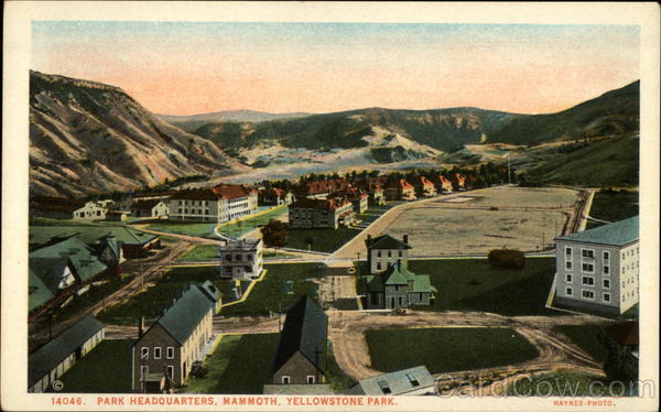 Front: 14046. PARK HEADQUARTERS, MAMMOTH, YELLOWSTONE PARK. HAYNES-PHOTO. Back: PUBLISHED BY J. E. HAYNES, ST. PAUL, OFFICIAL PHOTOGRAPHER, YELLOWSTONE NATIONAL PARK. COPYRIGHT BY J. E. HAYNES, ST. PAUL. R-64127 Foreign, 2c Domestic, 1c [Stamp Here