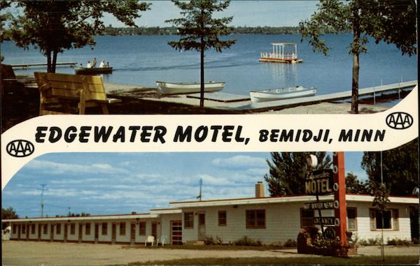 | Edgewater Motel located on beautiful Lake Bemidji in Bemidji, Minnesota on highways 2- 71- 371. Individually controlled hot water heat, telephones, television and AAA recommended. Kitchenette units are available. Boats and children's playground for your added pleasure. Mr. and Mrs. R. M. Bluth, owners. Phone PL 1-3600 |