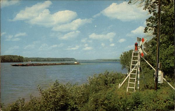 Ky. 42 BEACON LIGHT ON OHIO RIVER Near Louisville, Kentucky. Barge passing. K_9432 Lusterchrome" REG. REG. U.S. PAT. OFF. MADE BY TICHNOR BROS., INC., BOSTON 15, MASS. Kentucky the blue grass stote Suice 1792