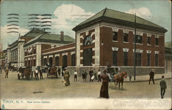Front: TROY, N.Y. New Union Station. Back: .N.Y. RD TRO SEP-6 11-AM 1907 -T Raphael Tuck & Sons' Post Card Series NO 2028, "Troy, N.Y." ART PUBLISHERS TO THEIR MAJESTIES THE KING AND QUEEN, Mess Frances Sitz zellen Sy и С. Durchschung wang racuse Vo