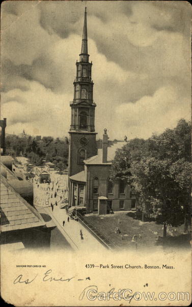 Front: SOUVENIR POST CARD CO N.L 4339–Park Street Church, Boston, Mass. as Ener Billy, Back: 14 SLNOM VOLONTHS 5621 DEL FEB th 130P 1995 SaISANO VONNVIO AL Mes E. L. Martin Bham. Ale 2318 Aren