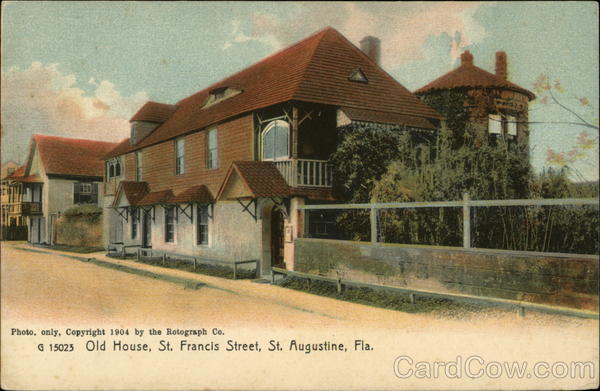 Front: Photo, only, Copyright 1904 by the Rotograph Co. G 15023 Old House, St. Francis Street, St. Augustine, Fla. Back: isico 15. The Rotograph Co., N. Y., City. (Germany.) CO. IN
