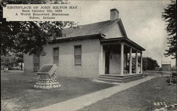 Front: BIRTHPLACE OF JOHN MILTON HAY Born October 8th, 1838 A World Renowned Statesman Salem, Indiana 2577 Back: The Dexter Press, Pearl River, N. Y. so