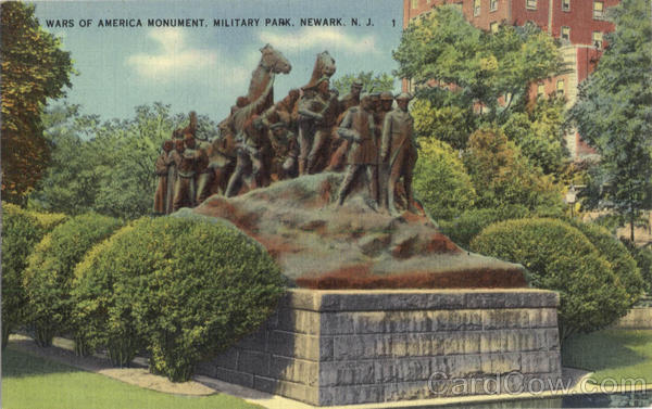 Front: WARS OF AMERICA MONUMENT, MILITARY PARK, NEWARK, N. J. 1 Back: 150 MADE IN USA "TICHNOR QUALITY VIEWS REG. U.S. PAT, OFF. MADE ONLY BY TICHNOR BROS., INC., BOSTON, MASS, 62178 STAR STATIONERY CO., NEWARK, N. J.
