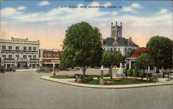 Front: CITY PLAZA, NEW BRAUNFELS, TEXAS-2 PLAZA HOTEL Back: CO 26114 Spend Your Vacation in New Braunfels -A "Natural Color Card" made by E. C. Kropp Co., Milwaukee, Wis.-BIF-